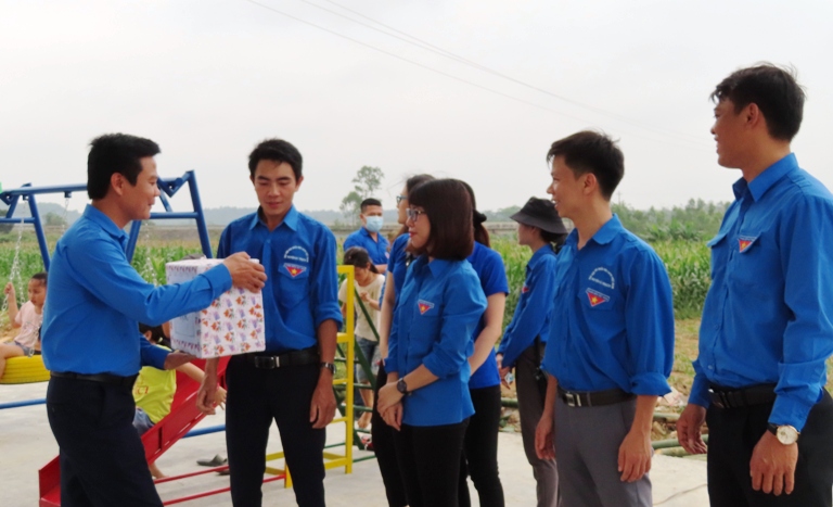 Đồng chí Trần Quốc Tuấn – Bí thư Tỉnh Đoàn tặng quà cho các bạn ĐVTN tham gia xây dựng sân chơi