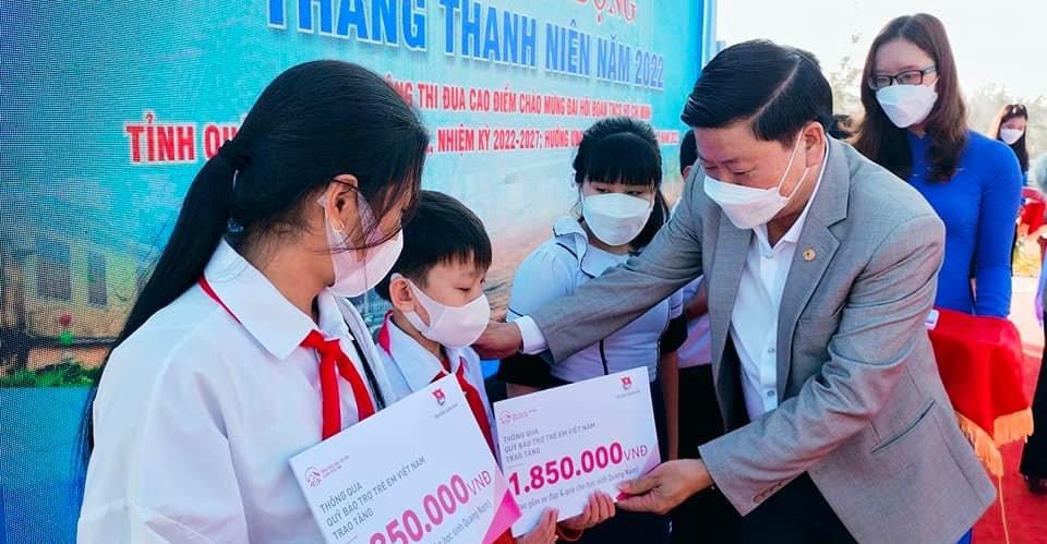 Đồng chí Nguyễn Bình Minh - Chánh Văn Phòng T.Ư Đoàn cùng lãnh đạo tỉnh Quảng Nam trao tặng quà cho các em học sinh và các gia đình có hoàn cảnh khó khăn