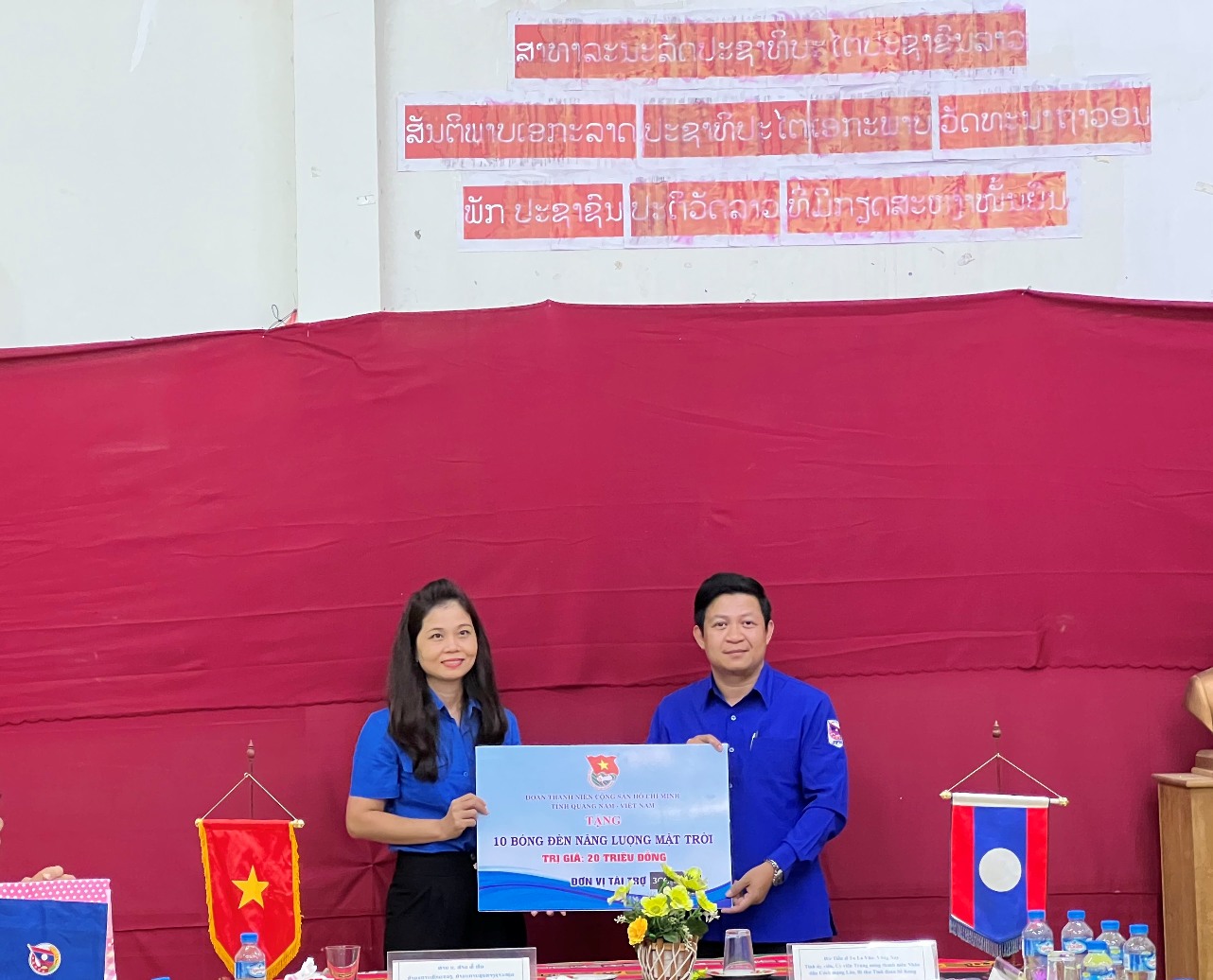 Bí thư Tỉnh đoàn Phạm Thị Thanh tặng 10 bóng đèn năng lượng mặt trời cho Tỉnh đoàn Sê Kông.