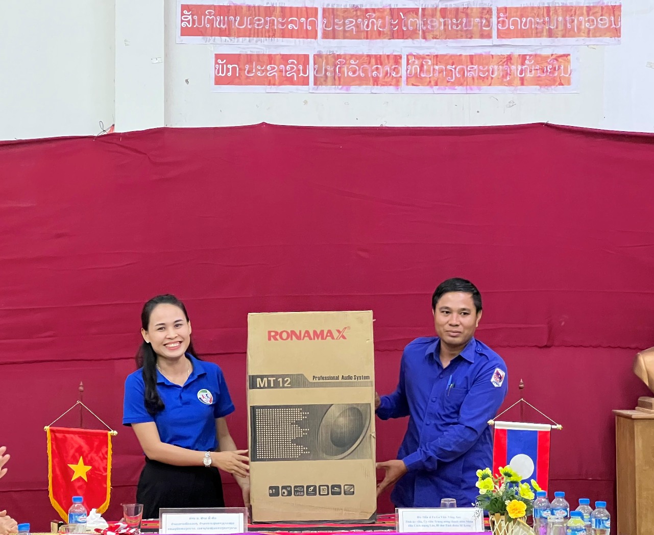 Phó Bí thư Tỉnh đoàn - Hoàng Văn Thanh trao quà cho cán bộ Tỉnh đoàn Sê Kông (Lào)