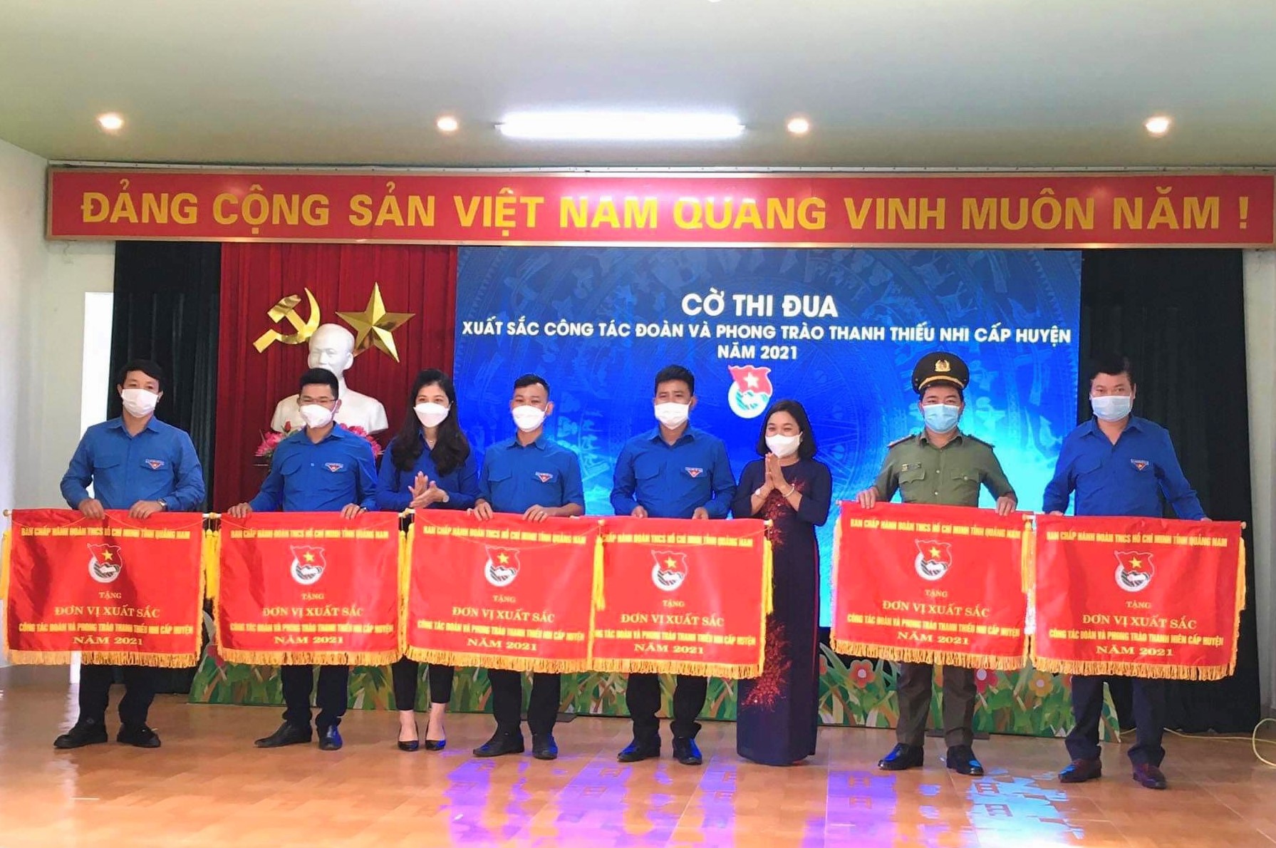 Đồng chí Phạm Thị Thanh - Bí thư Tỉnh đoàn và đồng chí Huỳnh Thị Thuỳ Dung- Uỷ viên Ban Thường vụ, Trưởng ban Dân vận Tỉnh uỷ trao cờ thi đua cho các tập thể có thành tích xuất sắc trong công tác Đoàn và phong trào thanh thiếu nhi cấp huyện năm 2021
