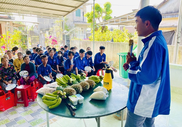 BTC hướng dẫn đoàn viên và bà con nhân dân thực hành chế phẩm sinh học IMO trong xử lý rác thải sinh hoạt hằng ngày.