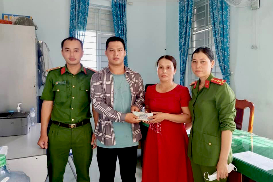Công an xã Phổ Thuận (TX.Đức Phổ) và anh Nguyễn Đình Nhiệm trao lại tài sản cho chị Lê Thị Tuyết Chung.