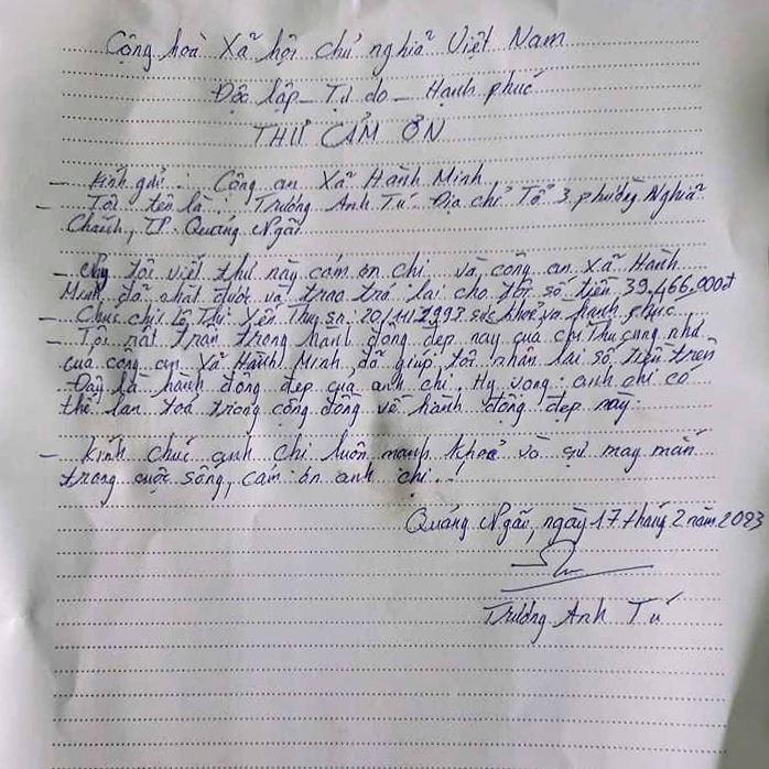 Anh Tú cũng đã có thư cảm ơn đến Công an xã Hành Minh và chị Lê Thị Yến Thu: Tôi rất trân trọng hành động đẹp này của chị Thu cũng như của Công an xã Hành Minh đã giúp tôi nhận lại số tiền trên. Đây là hành dộng đẹp của các anh chị. Hy vọng các anh chị lan tỏa hành động đẹp này trong cộng đồng.