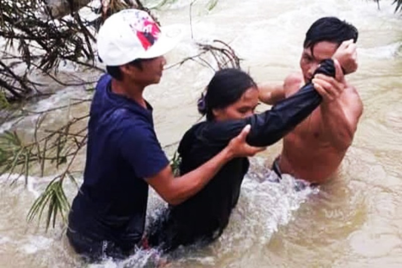 Đội thanh niên xung kích thuộc Đoàn xã Trà Tân, Trà Bồng, Quảng Ngãi tham gia cứu người trong mưa lũ