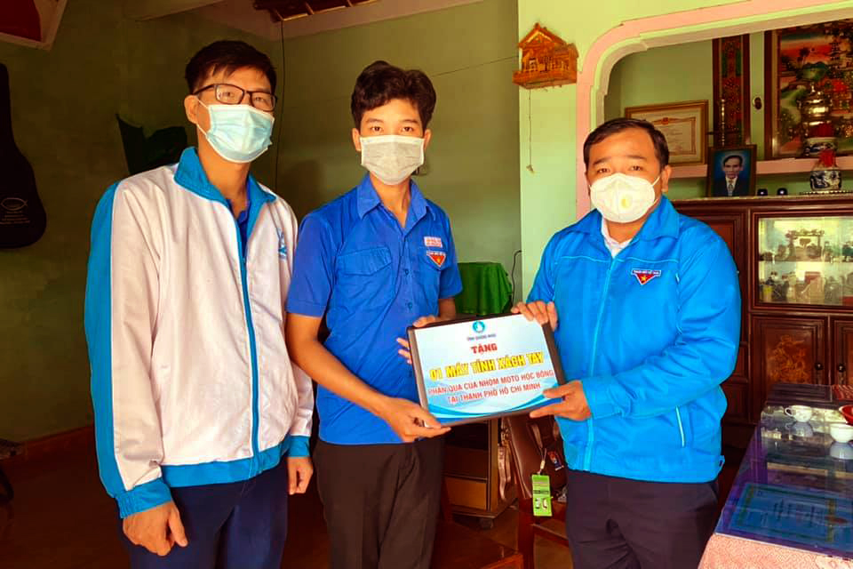 Anh Lê Văn Vin, Phó Bí thư Tỉnh đoàn, Chủ tịch Hội LHTN Việt Nam trao laptop cho em Tô Thành Nhiên tại nhà thờ họ Tô