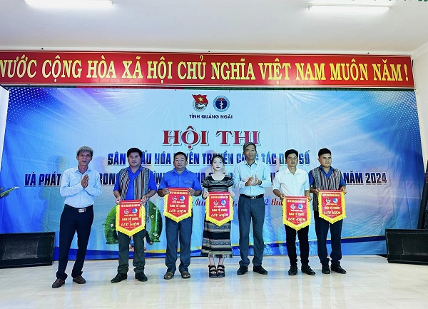 Đồng chí Lê Thanh Bình, Phó Bí thư Thường trực Huyện ủy Minh Long và đồng chí Đặng Văn Ngữ, Phó Trưởng phòng Dân số, Sở Y tế trao cờ lưu niệm cho các đội tham dự Hội thi.