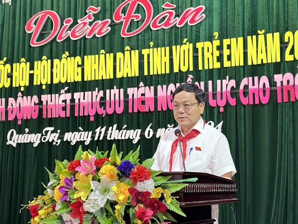 Phát biểu khai mạc chương trình, đồng chí Hoàng Đức Thắng - Phó Trưởng Đoàn Chuyên trách Đoàn đại biểu Quốc hội tỉnh nhấn mạnh: Diễn đàn năm nay hướng tới mục tiêu xây dựng một môi trường sống an toàn, thân thiện, lành mạnh, trẻ em được thực hiện đầy đủ quyền của trẻ em và bảo đảm trẻ em được phát triển toàn diện; đồng thời huy động sự tham gia của toàn hệ thống chính trị trong công tác chăm sóc và bảo vệ trẻ em. Đây cũng là dịp để các đại biểu Quốc hội và Hội đồng nhân dân tỉnh, lãnh đạo các Sở, ban, ngành, địa phương tiếp xúc, lắng nghe, giải quyết những tâm tư, nguyện vọng, kiến nghị của thiếu nhi tỉnh về những vấn đề liên quan đến nguồn lực cho trẻ em.