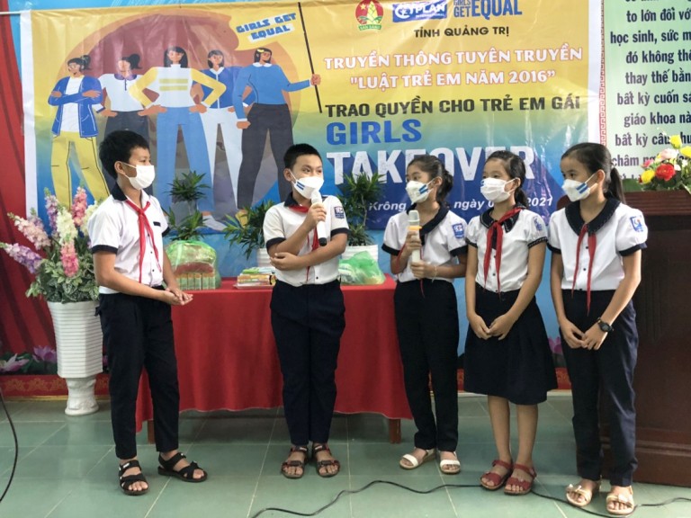 Tham gia hoạt động, các em đội viên, thiếu nhi tham gia thảo luận nhóm và các trò chơi nhỏ với chủ đề quan đến Luật Trẻ em năm 2016; Trẻ em gái lãnh đạo; an toàn trên không gian mạng; tảo hôn. Ngoài ra, các em được xem các phóng sự và chia sẻ về mô hình “Hội đồng Trẻ em” tỉnh Quảng Trị. Cũng tại chương trình, các em học sinh đồng loạt tham gia ký thư ngõ toàn cầu đồng hành cùng trẻ em gái chia sẻ về vấn đề tin giả, tin sai lệch trên không gian mạng.