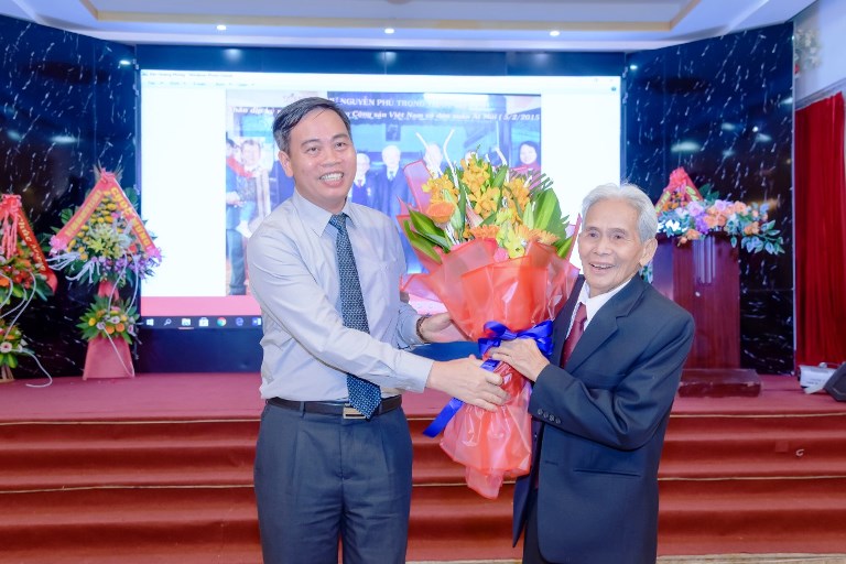 Đồng chí Nguyễn Đăng Quang - Phó Bí thư thường trực Tỉnh ủy, Chủ tịch HĐND tỉnh tặng hoa cho bác Hoàng Phùng - người có thời gian bị giam tù là 6.887 ngày đêm, tức là hơn 19 năm.