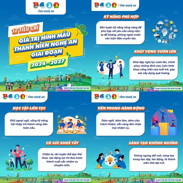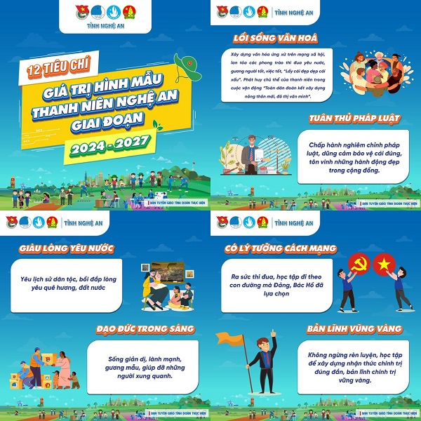 Năm 2024, nhằm cụ thể hóa Kế hoạch số 71-KH/TWĐTN-BTG ngày 29/5/2023 của Ban Thường vụ Trung ương Đoàn triển khai thực hiện Quyết định số 311/QĐ-TTg ngày 05/3/2022 của Thủ tướng Chính phủ, Kế hoạch số 248/KH-UBND ngày 13/4/2023 của UBND tỉnh Nghệ An về thực hiện Chương trình “Giáo dục lý tưởng cách mạng, đạo đức, lối sống văn hóa cho thanh niên, thiếu niên, nhi đồng trên không gian mạng giai đoạn 2022 - 2030”, Ban Thường vụ Tỉnh đoàn đã ban hành văn bản chỉ đạo cơ sở, xây dựng bộ infographic trên 12 tiêu chí trong đó xác định các nội dung thực hiện bám sát điều kiện, thực tế phong trào tại địa phương, gắn với yêu cầu, nhiệm vụ của thanh niên Nghệ An.