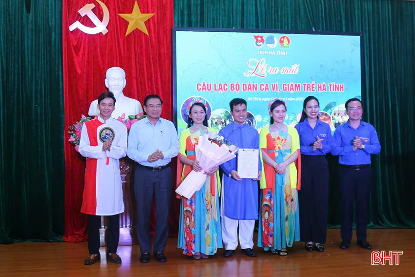 Đại diện Sở VH-TT&DL, Tỉnh đoàn trao quyết định thành lập và tặng hoa chúc mừng Câu lạc bộ Dân ca ví, giặm trẻ Hà Tĩnh cho Ban Chủ nhiệm câu lạc bộ.