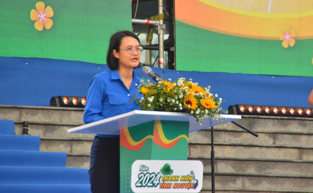 Đồng chí Trần Thu Hà - Phó Bí thư Thành Đoàn, Chủ tịch Hội Sinh viên Thành phố Hồ Chí Minh phát biểu tại buổi lễ