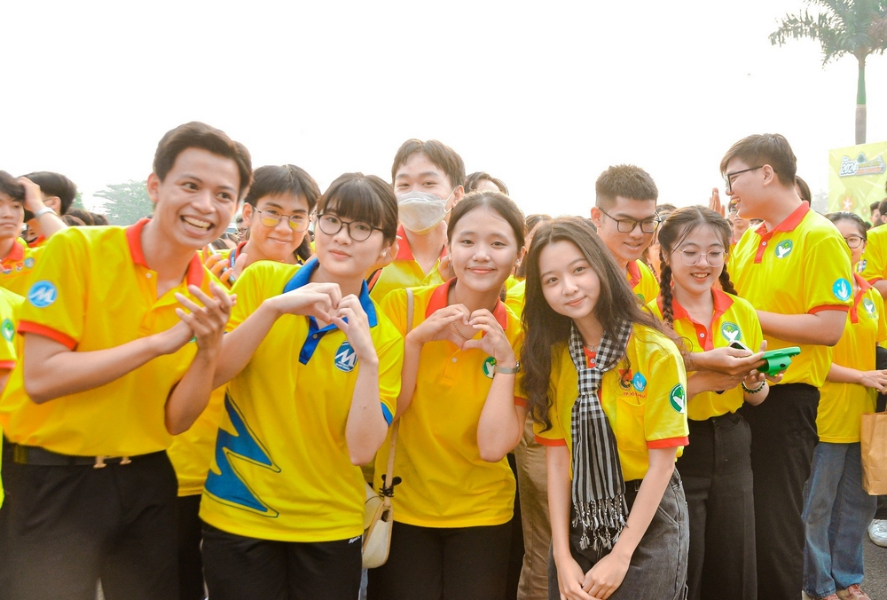 Diễn viên Lâm Thanh Mỹ - Đại sứ Chiến dịch Xuân tình nguyện lần thứ 16 năm 2024 phấn khởi cùng các bạn sinh viên tại lễ ra quân