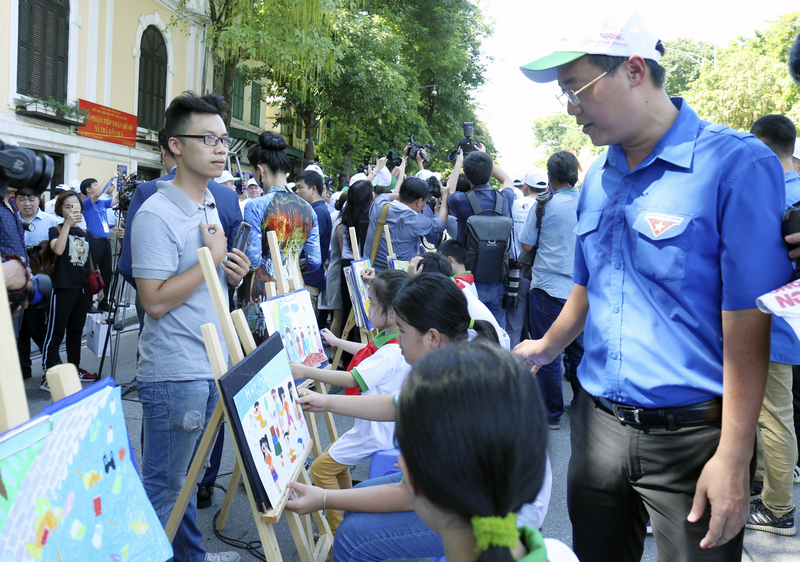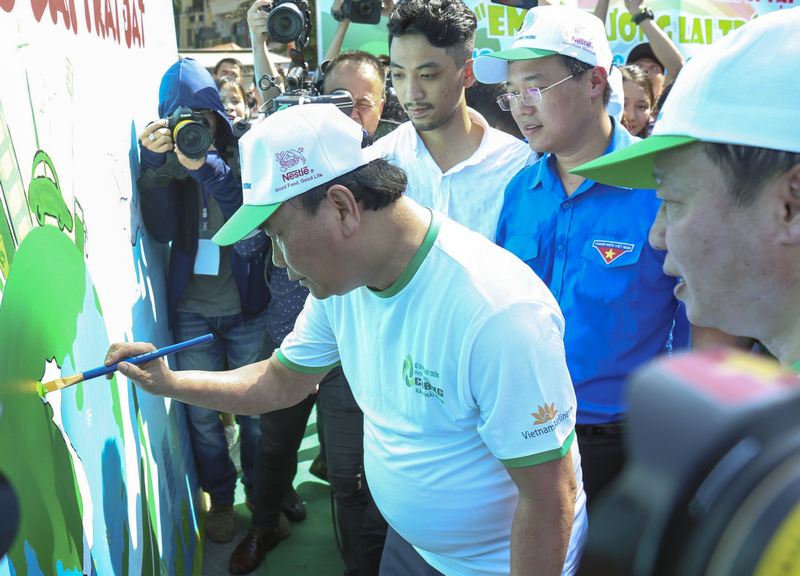 Thủ tướng Nguyễn Xuân Phúc và Bí thư thứ nhất TƯ Đoàn Lê Quốc Phong cùng các em thiếu nhi vẽ tranh cổ vũ phong trào chống rác thải nhựa. Bức tranh  có chủ đề " Em là tương lai Trái đất" có diện tích 10m2 thể hiện mong muốn sống trong một môi trường hòa bình và an toàn không bị ảnh hưởng bởi rác thải nhựa
