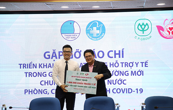 Đại diện Công ty Cổ phần Chăn nuôi C.P Việt Nam trao bảng tượng trưng hỗ trợ khẩu trang y tế cho các đơn vị.