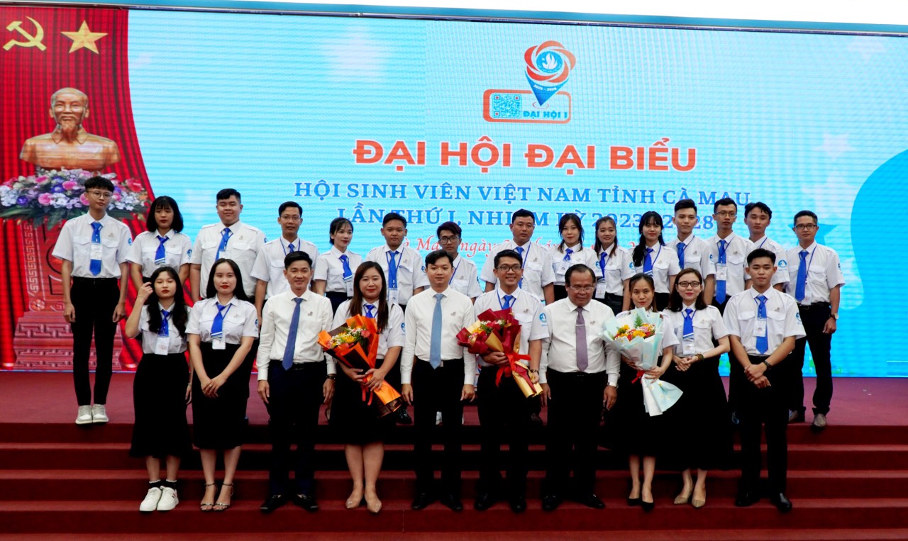Chủ tịch Hội Sinh viên Việt Nam Nguyễn Minh Triết; Phó Chủ tịch UBND tỉnh Nguyễn Minh Luân; Bí thư Tỉnh đoàn Nguyễn Hoàng Đạo tặng hoa chúc mừng Ban Chấp hành Hội Sinh viên Việt Nam tỉnh Cà Mau khóa I, nhiệm kỳ 2023 - 2028 ra mắt tại Đại hội