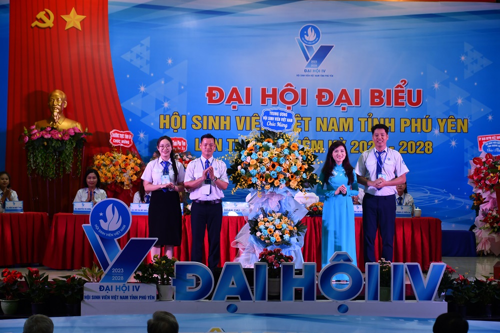 Đồng chí Hồ Hồng Nguyên, Ủy viên BTV Trung ương Đoàn, Trưởng Ban Thanh niên Trường học Trung ương Đoàn, Phó Chủ tịch Thường trực Trung ương Hội Sinh viên Việt Nam và các đồng chí lãnh đạo tỉnh Phú Yên, Thường trực Tỉnh Đoàn tặng hoa chức mừng Ban Chấp hành Hội Sinh viên Việt Nam tỉnh Phú Yên khóa IV.