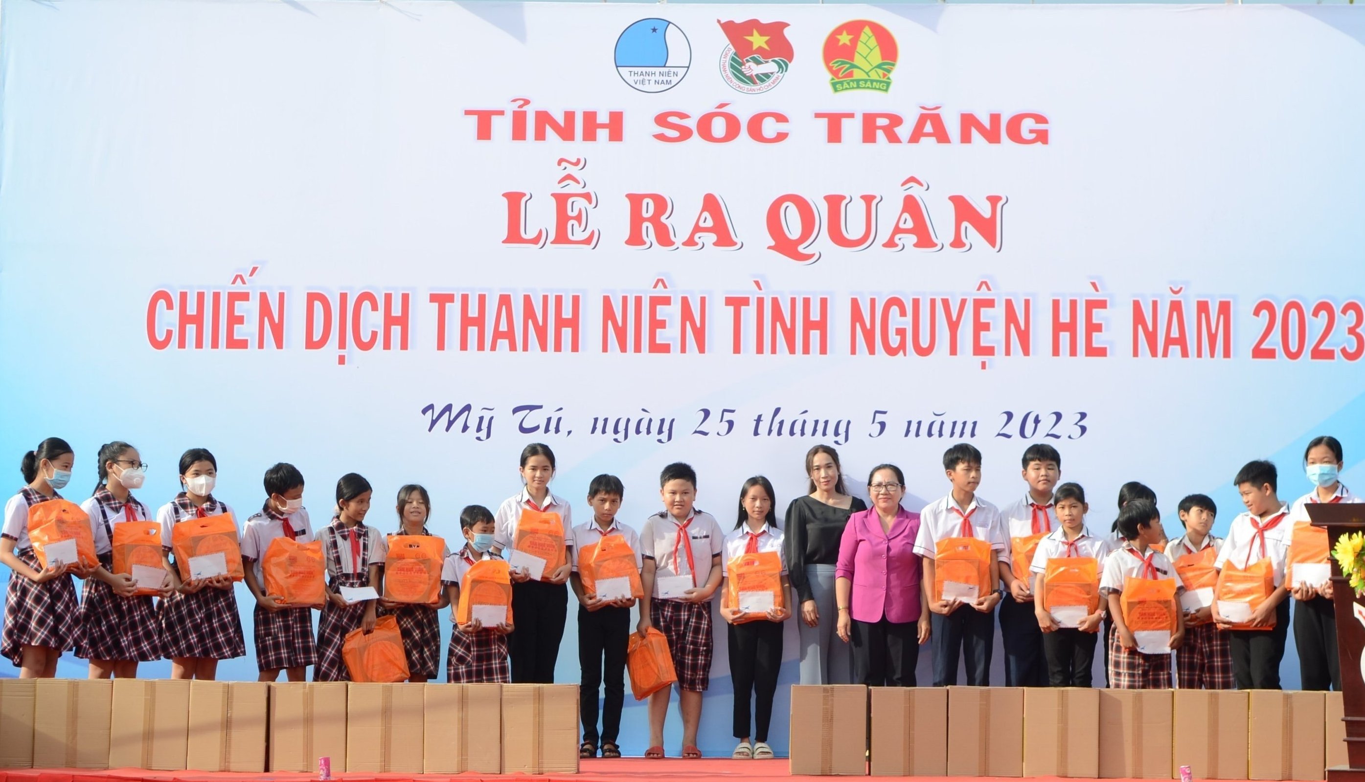 Tại buổi Lễ, Tỉnh ủy - Ủy ban MTTQ Việt Nam tỉnh đã trao 20 căn nhà Đại đoàn kết cho đoàn viên, thanh niên có hoàn cảnh khó khăn về nhà ở, mỗi căn trị giá 50 triệu đồng; Tỉnh Đoàn trao tặng 01 công trình sân thể thao cộng đồng, liên hợp sân bóng đá, bóng chuyền và dụng cụ thể thao và 01 công trình thanh niên “Thắp sáng đường quê” cho xã Phú Mỹ, huyện Mỹ Tú; trao tặng 2.000 quyển tập cho Hội đồng đội huyện Mỹ Tú; VNPT Sóc Trăng trao tặng công trình Chuyển đổi số cho Tỉnh Đoàn; Hội nạn nhân chất độc da cam tỉnh Sóc Trăng trao 50 phần quà cho trẻ em khuyết tật, trẻ em có hoàn cảnh khó khăn. Bên cạnh đó, Huyện Đoàn Mỹ Tú trao hỗ trợ vốn vay cho 02 thanh niên ứng dụng khoa học kỹ thuật vào trong sản xuất; trao 300 cây xanh cho Đoàn xã Long Hưng để thực hiện các công trình, phần việc thanh niên xây dựng nông thôn mới tại địa phương. Tổng nguồn lực được trao tặng tại buổi Lễ ra quân là gần 1,3 tỷ đồng.