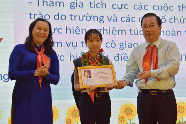 Đồng chí Lâm Văn Mẫn - Ủy viên dự khuyết BCH Trung ương Đảng, Phó Bí thư Tỉnh ủy, Chủ tịch Hội đồng Nhân dân tỉnh; đồng chí Võ Kim Chuyền - Bí thư Tỉnh đoàn trao Giải thưởng Kim Đồng năm học 2018 - 2019 cho em Phạm Kim Bảng - Chi đội trưởng chi đội 9a3 - Liên đội trưởng THCS Châu Văn Đơ, thị Xã Vĩnh Châu