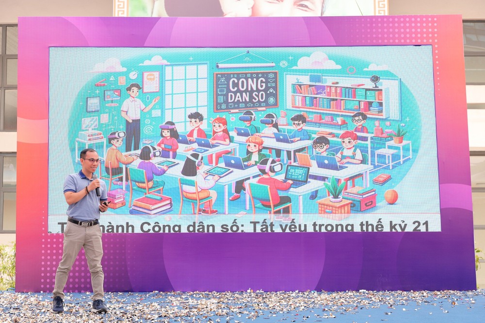 Tại Chương trình “Gặp gỡ con người số”, các bạn học sinh, sinh viên đã được gặp gỡ và lắng nghe những chia sẻ của anh Lê Anh Tiến, Giải thưởng Quả Cầu Vàng năm 2015, Gương mặt trẻ Việt Nam tiêu biểu năm 2019 lĩnh vực Kinh doanh - Khởi nghiệp. Anh là CEO của Công ty cổ phần Công nghệ Chatbot Việt Nam, vận hành nền tảng Chatbot bán hàng số 01 tại Việt Nam với hơn 10 triệu người dùng từ nhiều quốc gia.