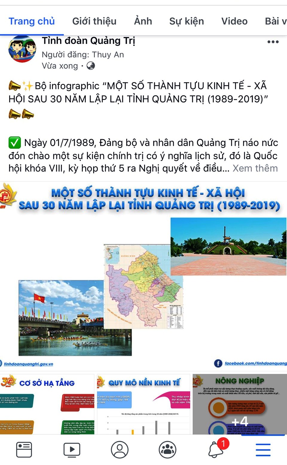 Bộ infographic “Những thành tựu cơ bản sau 30 năm lập lại tỉnh Quảng Trị” do Ban Thường vụ Tỉnh Đoàn đăng tải trên Fanpage
