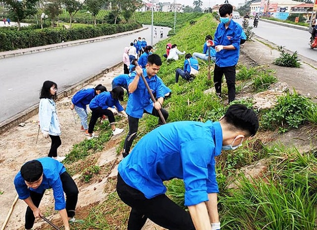 Dọn vệ sinh môi trường gắn với chương trình “Ngày Chủ nhật xanh” của Quận đoàn Long Biên.