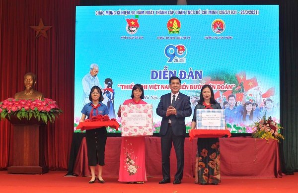 Đồng chí Nguyễn Đình Kiểm, Giám đốc Trung tâm Hướng dẫn hoạt động Thiếu nhi Trung ương trao quà cho thầy trò Trường THCS Yên Thường, huyện Gia Lâm, thành phố Hà Nội
