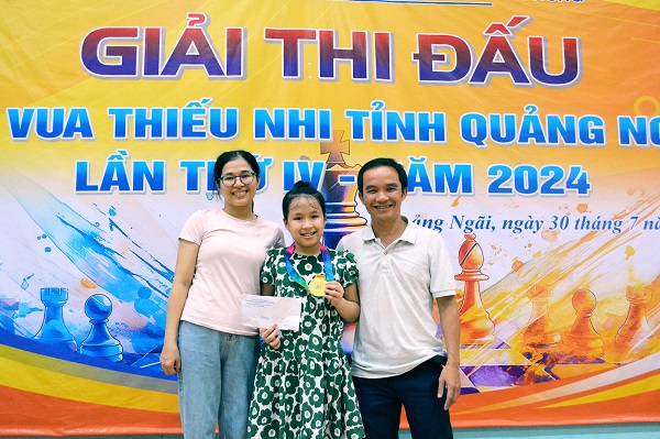 Huy chương vàng Trần Võ Mai Khuê (U9 nữ) ăn mừng cùng bố mẹ.