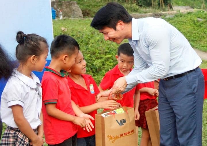 Đồng chí Nguyễn Ngọc Lương, Bí thư Trung ương Đoàn, Chủ tịch Trung ương Hội LHTN Việt Nam tặng quà cho các em thiếu nhi
