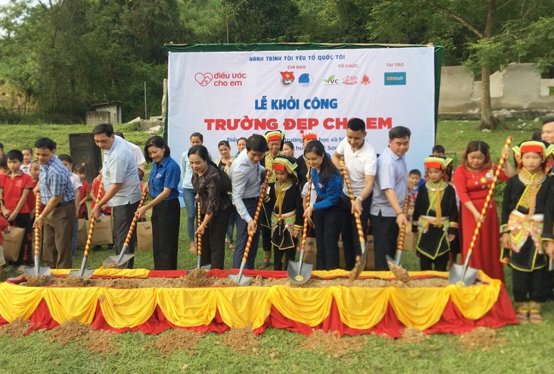 Đồng chí Nguyễn Ngọc Lương, Bí thư Trung ương Đoàn, Chủ tịch Trung ương Hội LHTN Việt Nam và đồng chí Đinh Thị Anh Thư - Bí thư Tỉnh đoàn, Phó Chủ tịch Hội LHTN Việt Nam tỉnh Lạng Sơn cùng các đại biểu tham gia khởi công công trình Trường đẹp cho em
