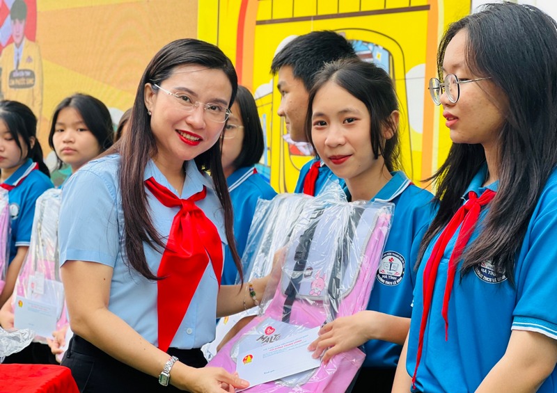 Đồng chí Nguyễn Phạm Duy Trang - Bí thư Trung ương Đoàn, Chủ tịch Hội đồng Đội Trung ương tặng học bổng cho thiếu nhi có hoàn cảnh khó khăn của tỉnh Hà Tĩnh