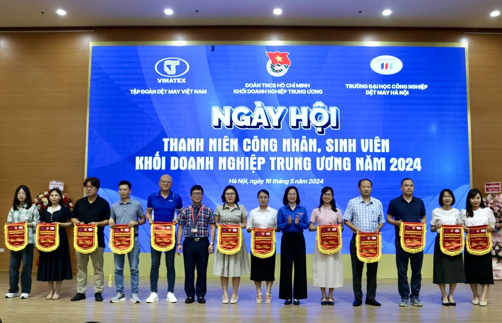 Bí thư Đoàn Khối Doanh nghiệp T.Ư Hoàng Thị Minh Thu và Hiệu trưởng Trường Đại học Công nghiệp Dệt may Hà Nội Hoàng Xuân Hiệp tặng cờ lưu niệm cho các doanh nghiệp