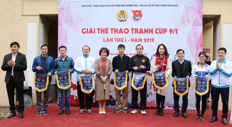 Phó Chủ tịch Công đoàn cơ quan Trung ương Đoàn Lê Hồng Hạnh; Bí thư Đoàn Thanh niên cơ quan Nguyễn Thái Hà và Phó Trưởng Ban Thanh niên Trường học Trung ương Đoàn Bùi Minh Tuấn tặng cờ lưu niệm cho các vận động viên. Ảnh Bảo Anh