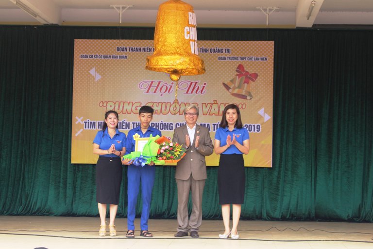 Ban Tổ chức trao cho em Hà Văn Hải, học sinh lớp 10B7 đạt Giải nhất trong Hội thi Rung chuông vàng tìm hiểu kiến thức phòng chống ma túy năm 2019 tại trường THPT Chế Lan Viên, huyện Cam Lộ.