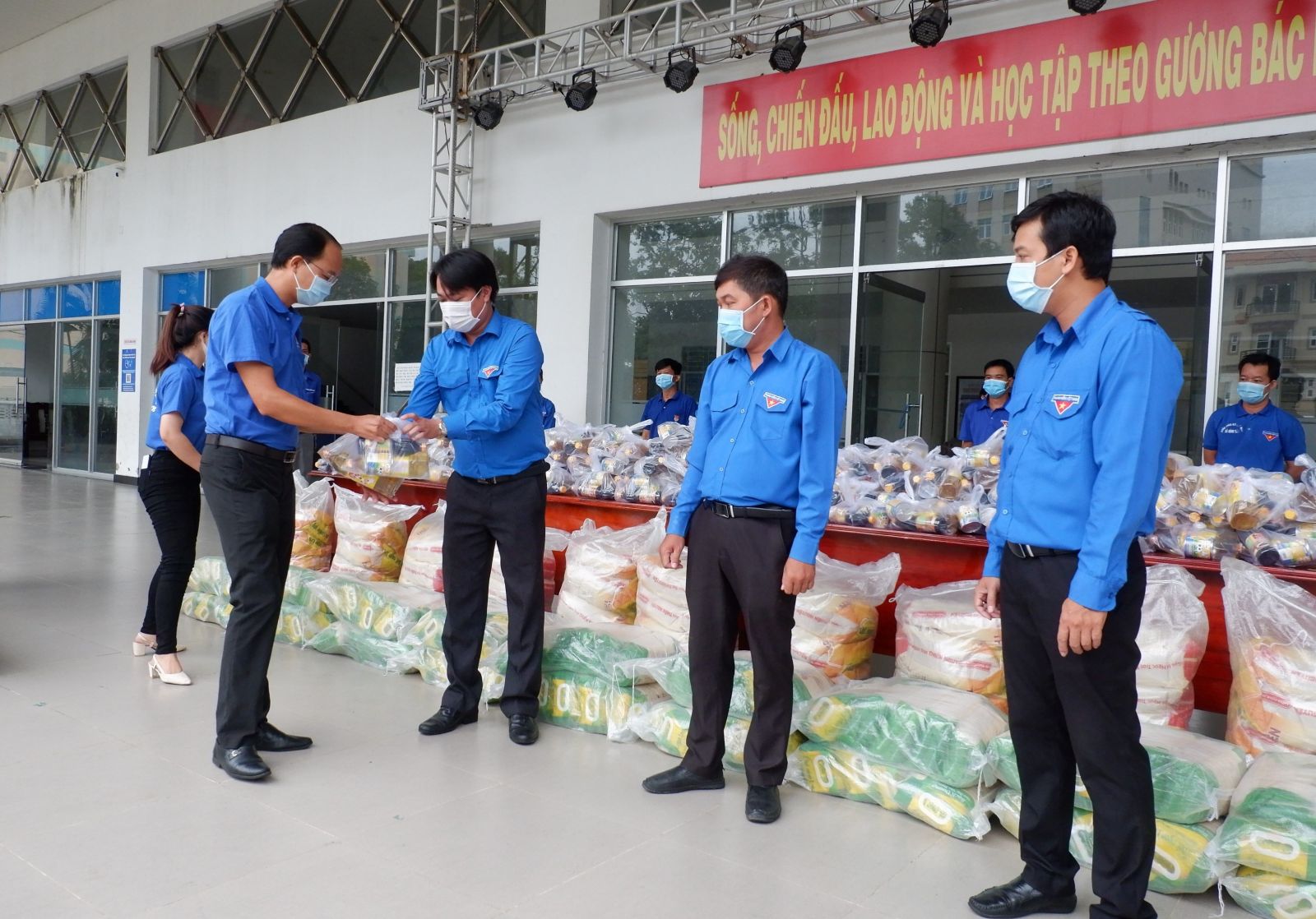 Đoàn viên, thanh niên Trường Mầm non thị trấn Cần Đước hỗ trợ thức ăn cho lực lượng làm nhiệm vụ tại các chốt phong tỏa, cách ly