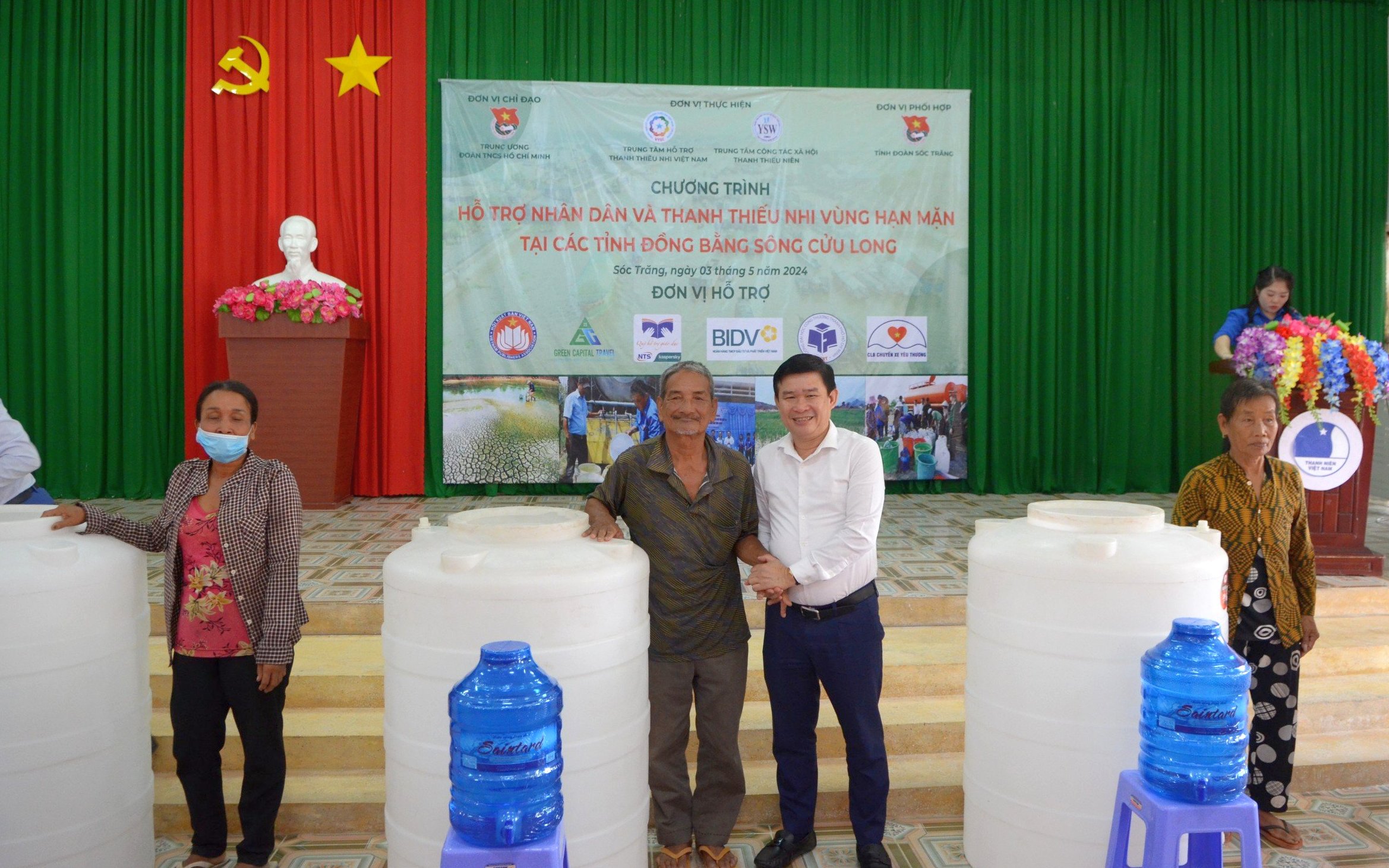 Được biết, chương trình hỗ trợ nhân dân và thanh thiếu nhi vùng hạn mặn được Trung ương Đoàn chỉ đạo tổ chức tại 03 tỉnh Bến Tre, Trà Vinh và Sóc Trăng. Tại tỉnh Sóc Trăng, Trung ương Đoàn đã trao tặng 20 bồn chứa nước (mỗi bồn có thể tích 500 lít) và 200 bình nước sạch cho người dân xã Long Phú, trị giá 50 triệu đồng, góp phần giúp người dân giảm bớt khó khăn về nước sinh hoạt trong mùa hạn mặn năm nay.