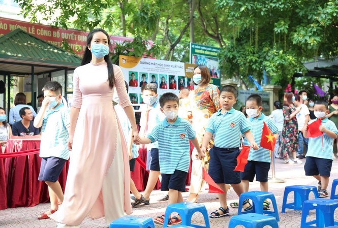 Các em học sinh lớp 1 và cô giáo trường Nguyễn Bỉnh Khiêm hân hoan chào đón năm học mới 2020-2021