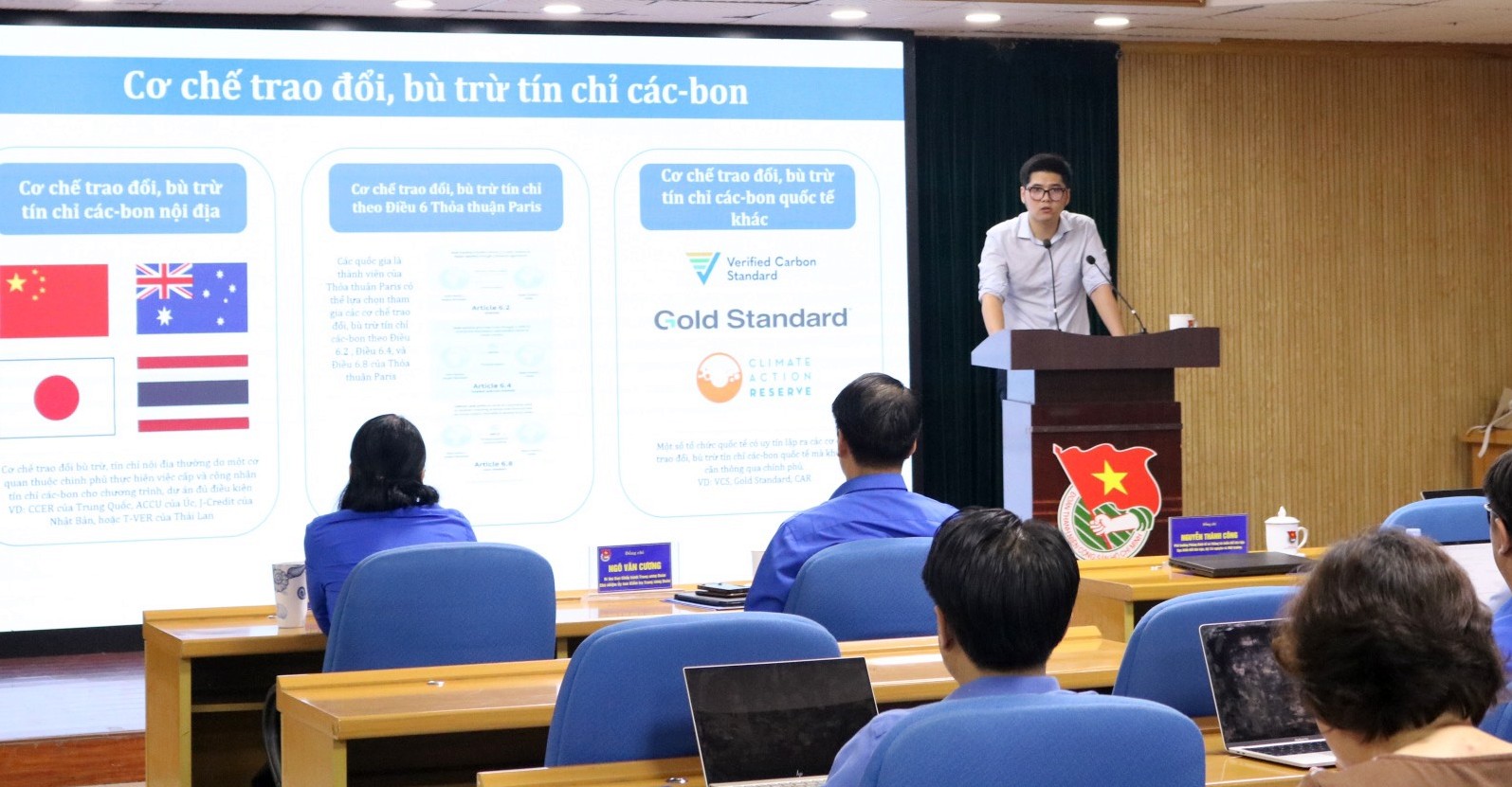 Đồng chí Nguyễn Thành Công, Phó trưởng phòng Kinh tế và Thông tin biến đổi khí hậu, Cục Biến đổi khí hậu, Bộ Tài nguyên và Môi trường trao đổi chuyền đề Phát triển thị trường carbon tại Việt Nam; chính sách, thị trường carbon trong nước và quốc tế; cơ hội cho nhân lực trẻ ở Việt Nam tại buổi tập huấn
