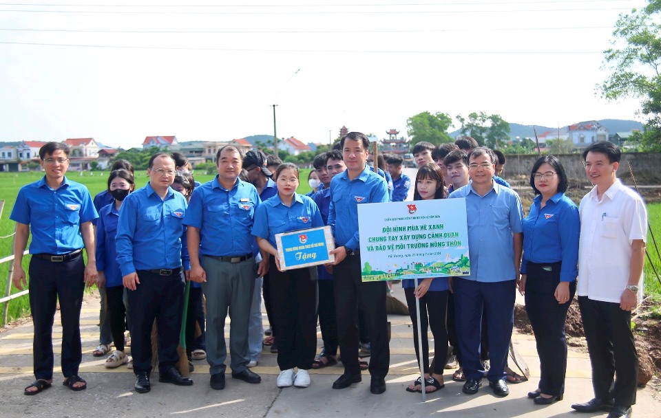 Các đồng chí lãnh đạo tặng quà cho đội hình Mùa hè xanh và cùng ĐVTN tham gia trồng “Hàng cây thanh niên”
