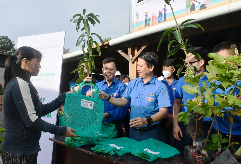 Đồng chí Lương Minh Tùng, Bí thư Tỉnh Đoàn, Chủ tịch Hội LHTN Việt Nam tỉnh Phú Yên tặng túi lưới đi chợ và cây xanh cho người dân địa phương xã An Hòa Hải, huyện Tuy An.