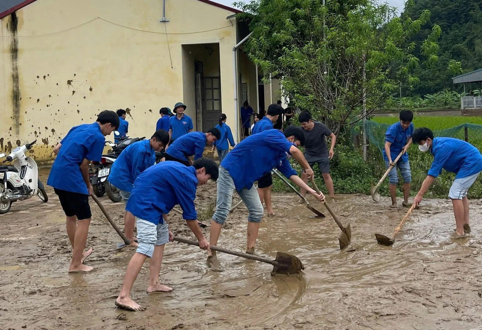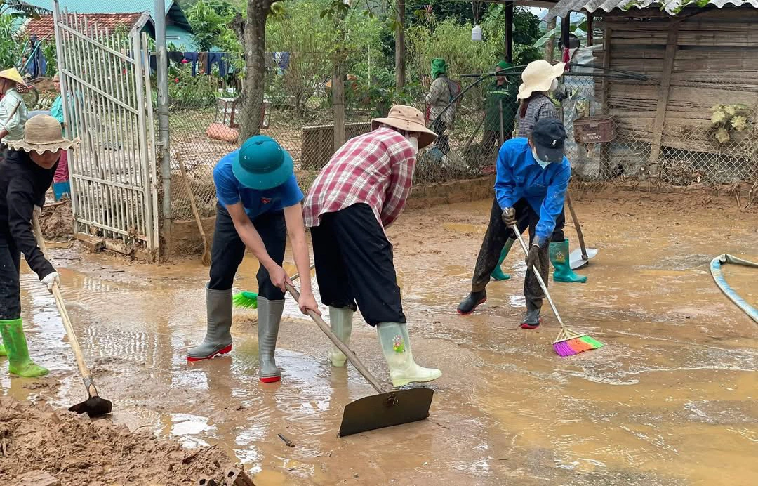 Ở xã Mường Bang, điểm Trường mầm non bản Tường Han bị bùn đất vùi lấp sau mưa bão. Đoàn viên, thanh niên cùng phụ huynh, giáo viên đã san gạt bùn, dựng lại cây xanh, làm sạch khuôn viên để trả lại môi trường an toàn, sạch đẹp.