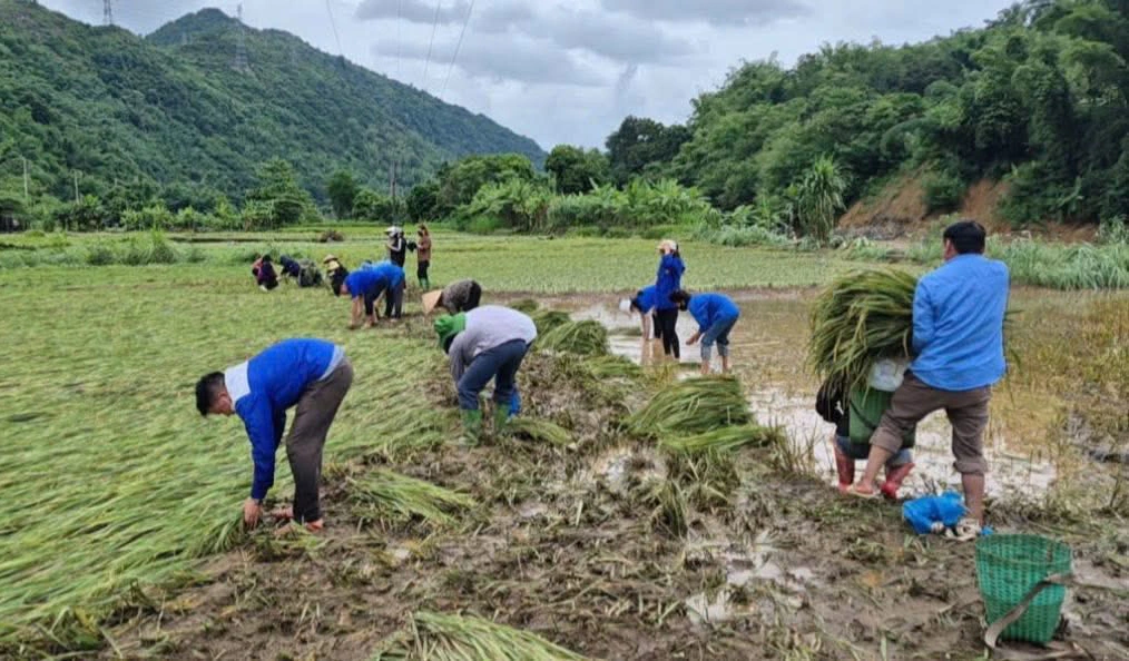 Tại xã Gia Phù, trên những cánh đồng lúa bị đổ rạp, hình ảnh các đoàn viên cùng bà con dựng từng khóm lúa, thu hoạch và vận chuyển về nơi an toàn đã để lại nhiều xúc động.