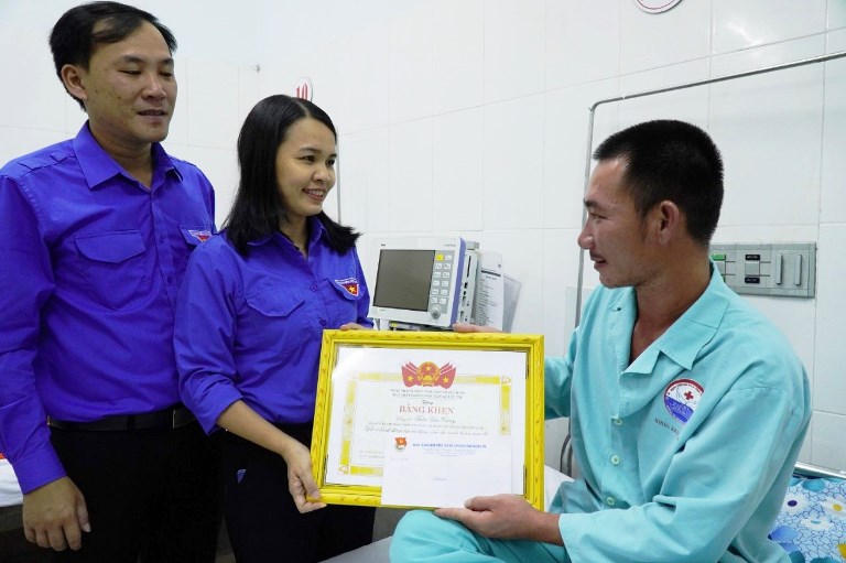 Đồng chí Trần Thị Thu, Bí thư Tỉnh Đoàn, Chủ tịch Hội LHTN Việt Nam tỉnh thăm động viên và tặng Bằng khen cho thanh niên dũng cảm Trần Xuân Cường tham gia giải cứu tàu Vietship 01 gặp nạn