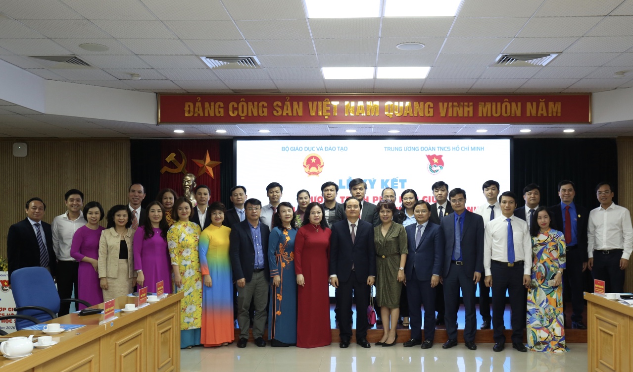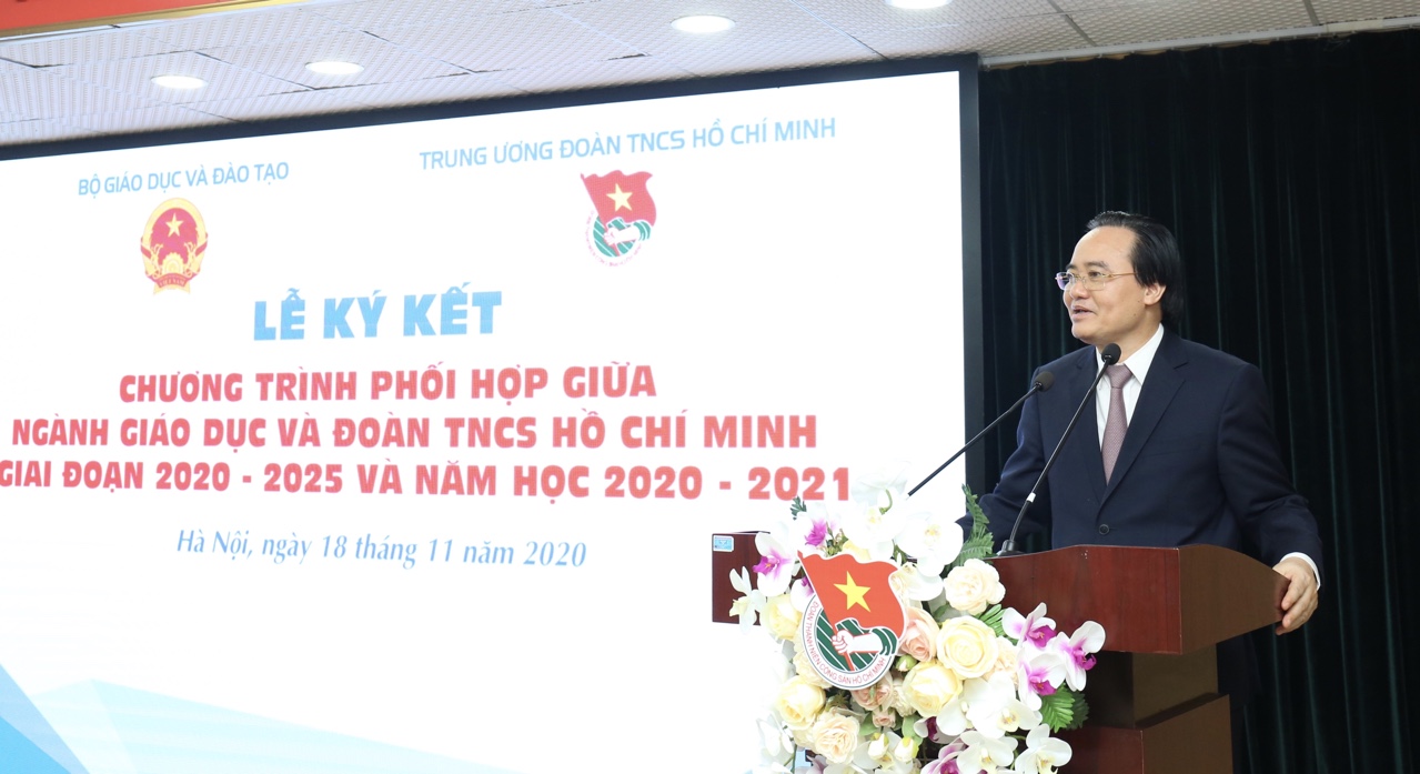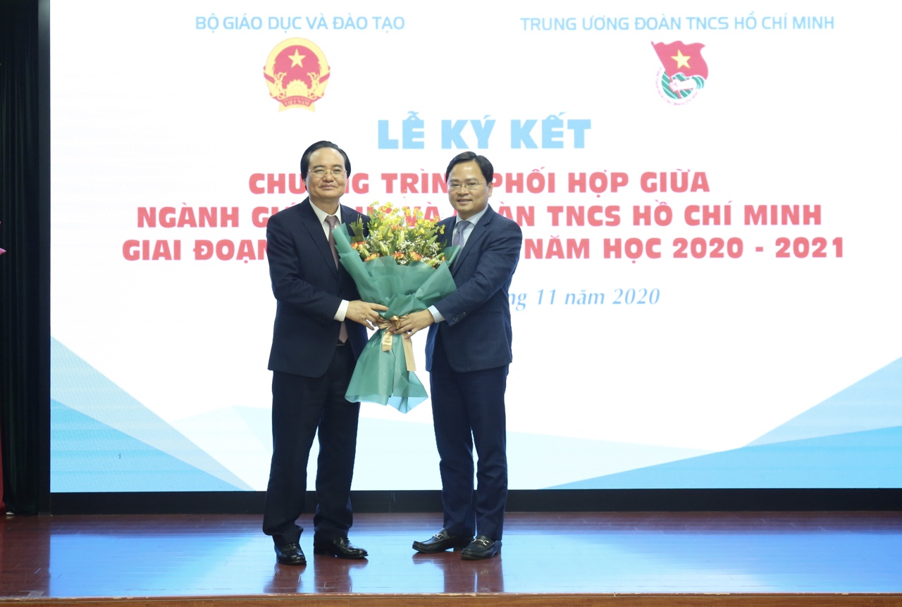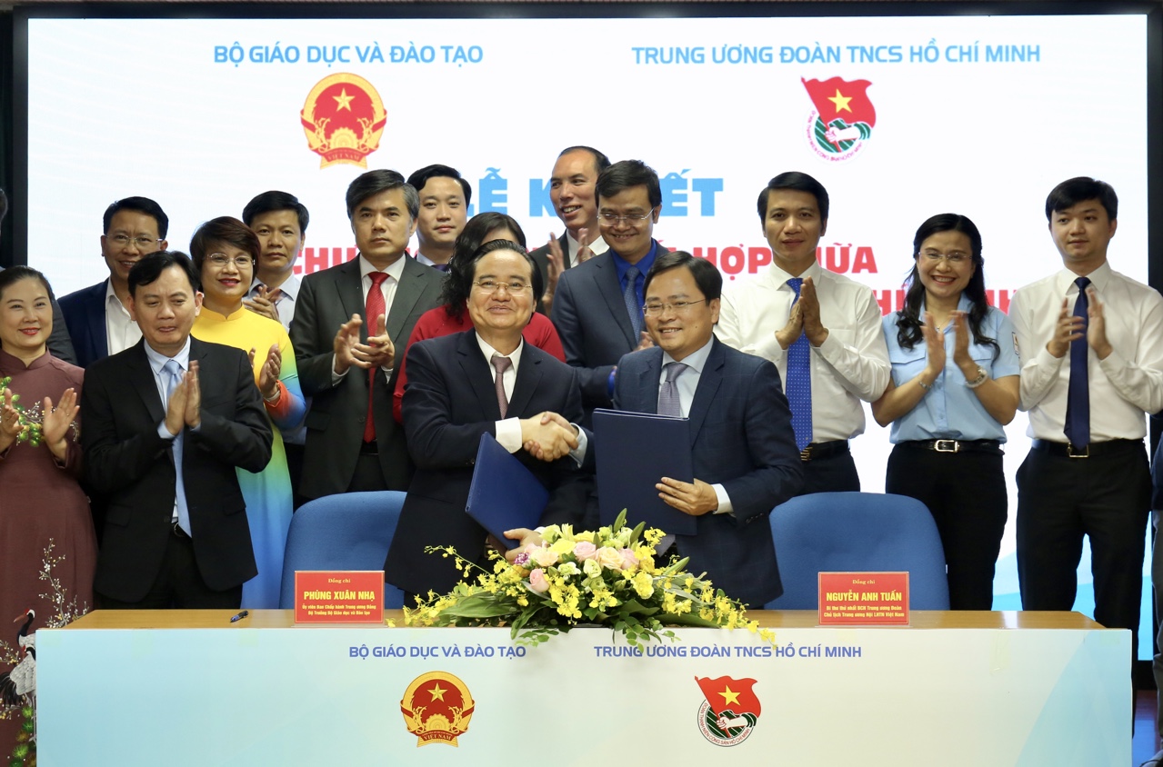 Bộ trưởng Bộ Giáo dục và Đào tạo Phùng Xuân Nhạ và Bí thư thứ nhất T.Ư Đoàn, Chủ tịch T.Ư Hội LHTN Việt Nam Nguyễn Anh Tuấn ký kết Chương trình phối hợp giai đoạn 2020-2025 giữa ngành giáo dục và Đoàn TNCS Hồ Chí Minh.