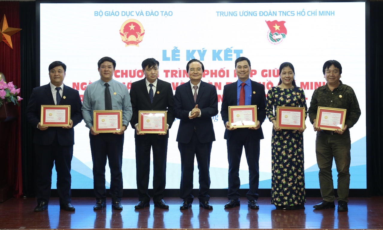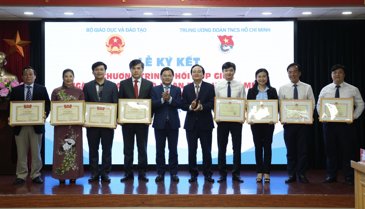 Bộ trưởng Bộ GD-ĐT Phùng Xuân Nhạ và Bí thư thứ nhất T.Ư Đoàn Nguyễn Anh Tuấn trao bằng khen cho những cá nhân có thành tích xuất sắc trong việc phối hợp thực hiện các chương trình của Bộ GD- ĐT và T.Ư Đoàn trong 5 năm qua