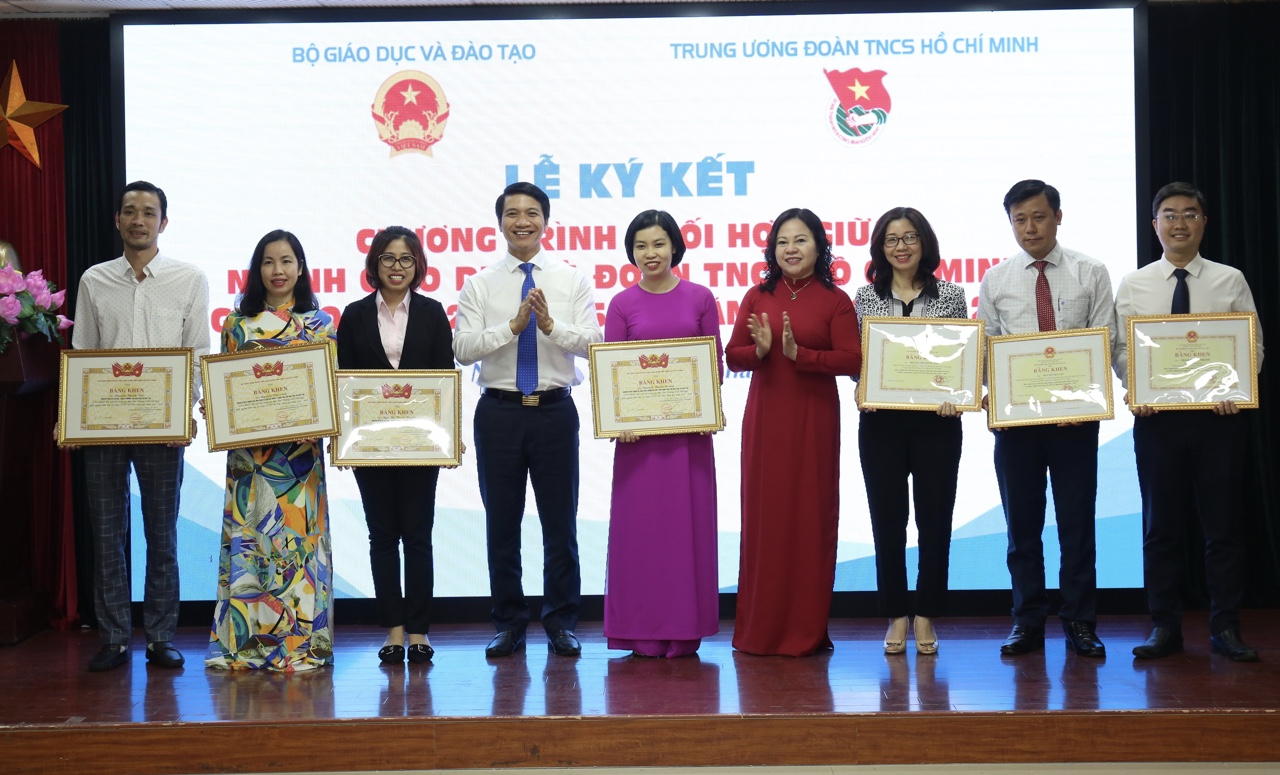 Bí thư TƯ Đoàn Bùi Quang Huy và Thứ trưởng Bộ GD-ĐT Ngô Thị Minh trao bằng khen cho những cá nhân có thành tích xuất sắc trong việc phối hợp thực hiện các chương trình của Bộ GD- ĐT và T.Ư Đoàn trong 5 năm qua