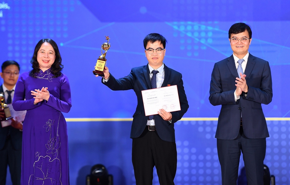 Đồng chí Võ Thị Ánh Xuân, Ủy viên T.Ư Đảng, Phó Chủ tịch nước CHXHCN Việt Nam và đồng chí Bùi Quang Huy - Ủy viên dự khuyết T.Ư Đảng, Bí thư thứ nhất T.Ư Đoàn trao Giải thưởng KHCN Quả Cầu Vàng năm 2023