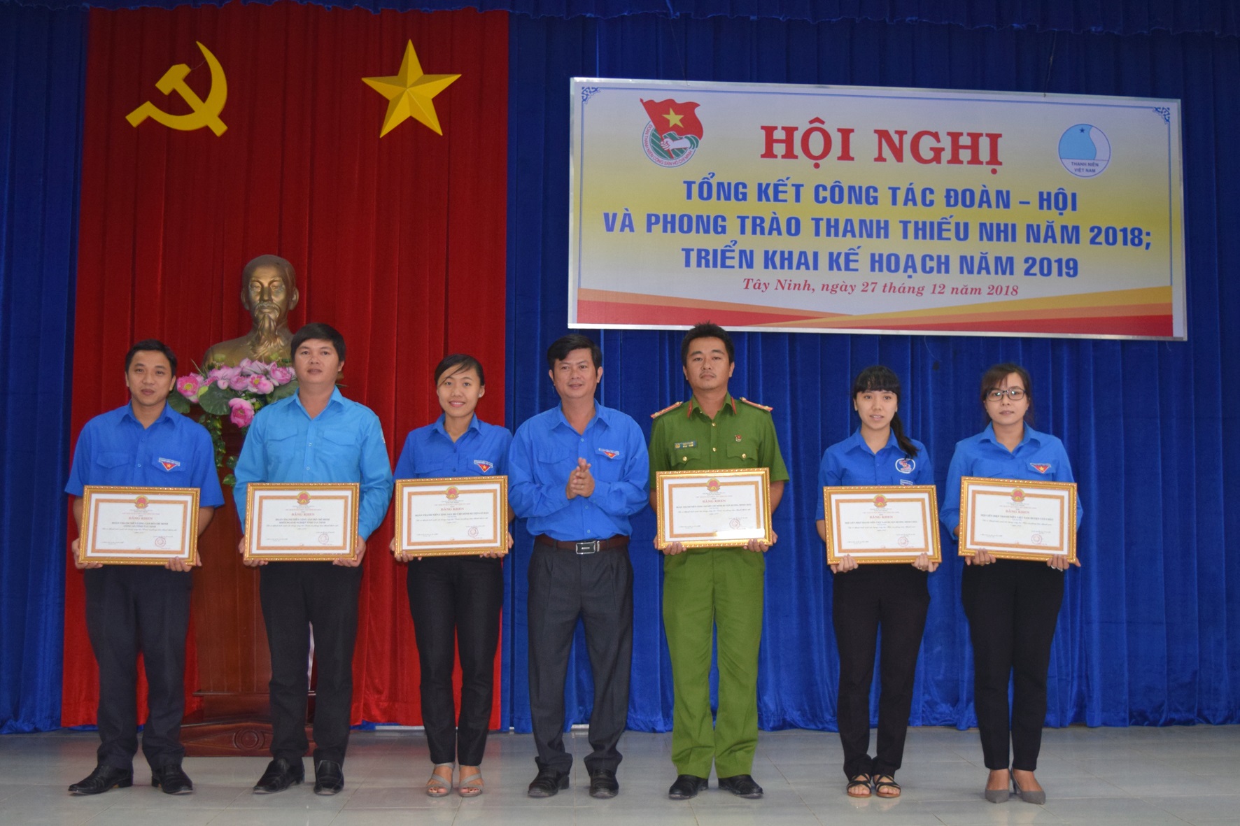 Thay mặt Chủ tịch UBND tỉnh, đồng chí Trưởng Ban Dân vận Tỉnh ủy đã trao Cờ Đơn vị dẫn đầu phong trào thi đua trong công tác Đoàn và phong trào thanh thiếu nhi năm 2018 cho Huyện đoàn Tân Châu và Cờ Đơn vị dẫn đầu phong trào thi đua công tác Hội và phong trào thanh niên năm 2018 cho Hội LHTNVN TP Tây Ninh.