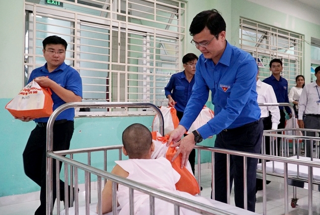 Thứ trưởng Bộ LĐ-TB&XH Lê Tấn Dũng và Bí thư Thành Đoàn TPHCM Phan Thị Thanh Phương tặng quà cho các bạn nhỏ